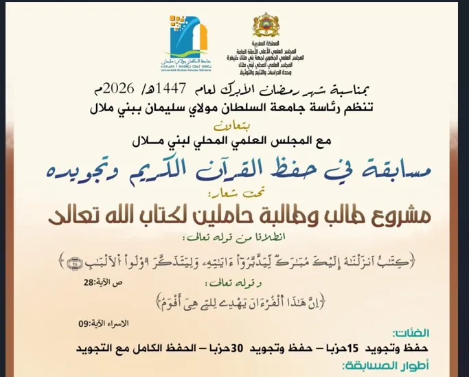 📢 تنظم جامعة السلطان مولاي سليمان الأسبوع الثقافي الجامعي، والذي سيمتد من 07 إلى 13 أبريل 2025، تحت شعار: "الجامعة تثمن الموروث الثقافي بجهة بني ملال خنيفرة"